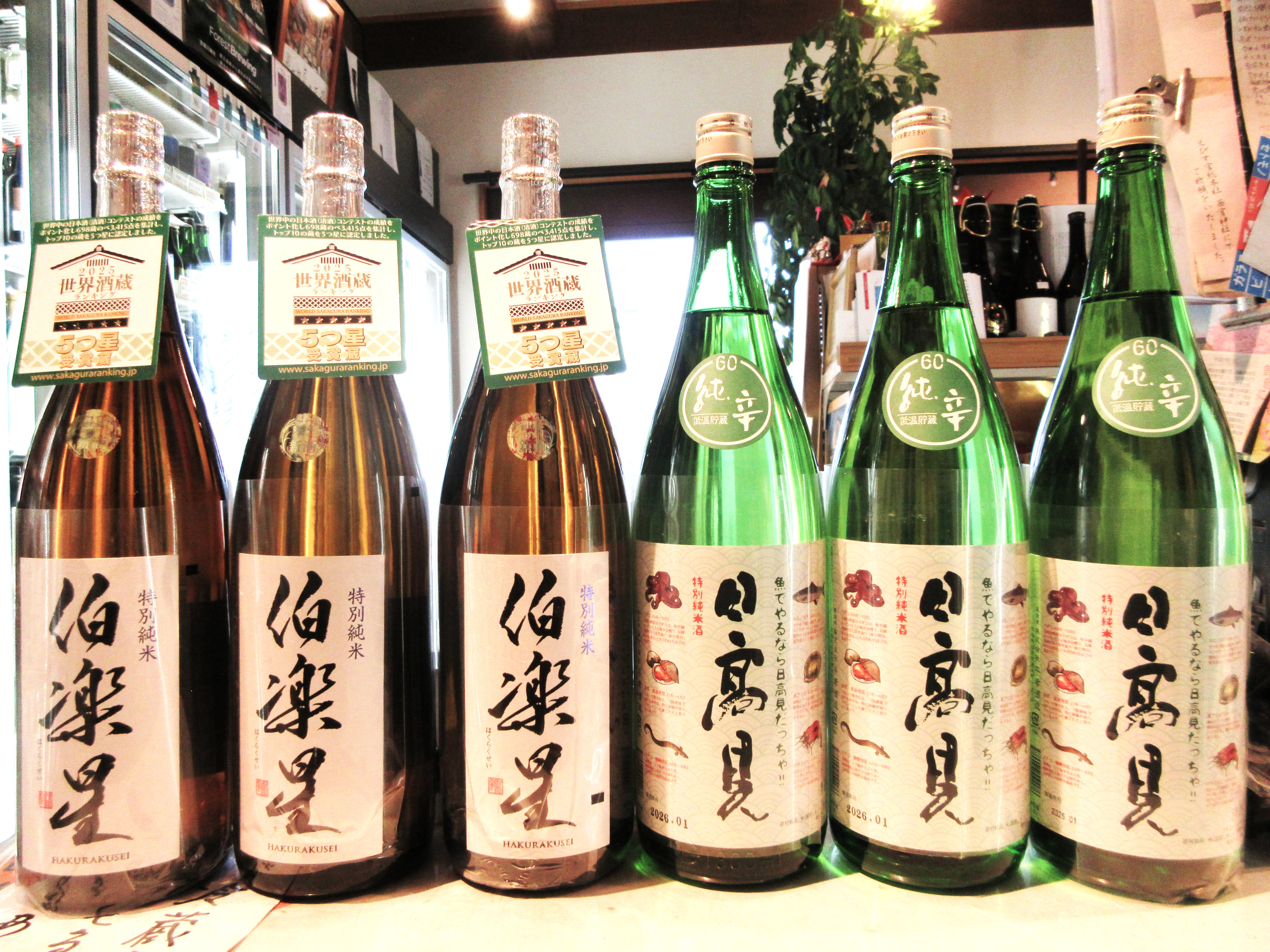伯楽星特別純米と 日高見特別純米魚ラベルと三本ずつ